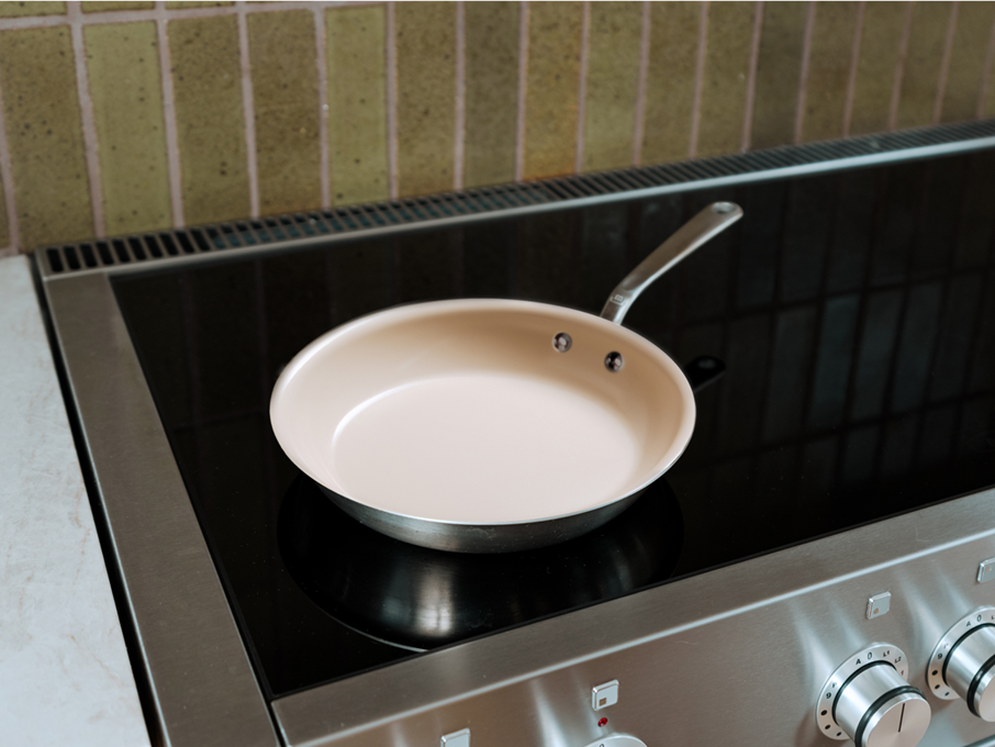 While ceramic pans from other brands use cheaply pasted-on induction discs, ours is optimized for it. Induction discs lead to hot or cold spots—particularly on the sides—while our fully cladded build ensures the entire pan is induction-compatible top to bottom.
