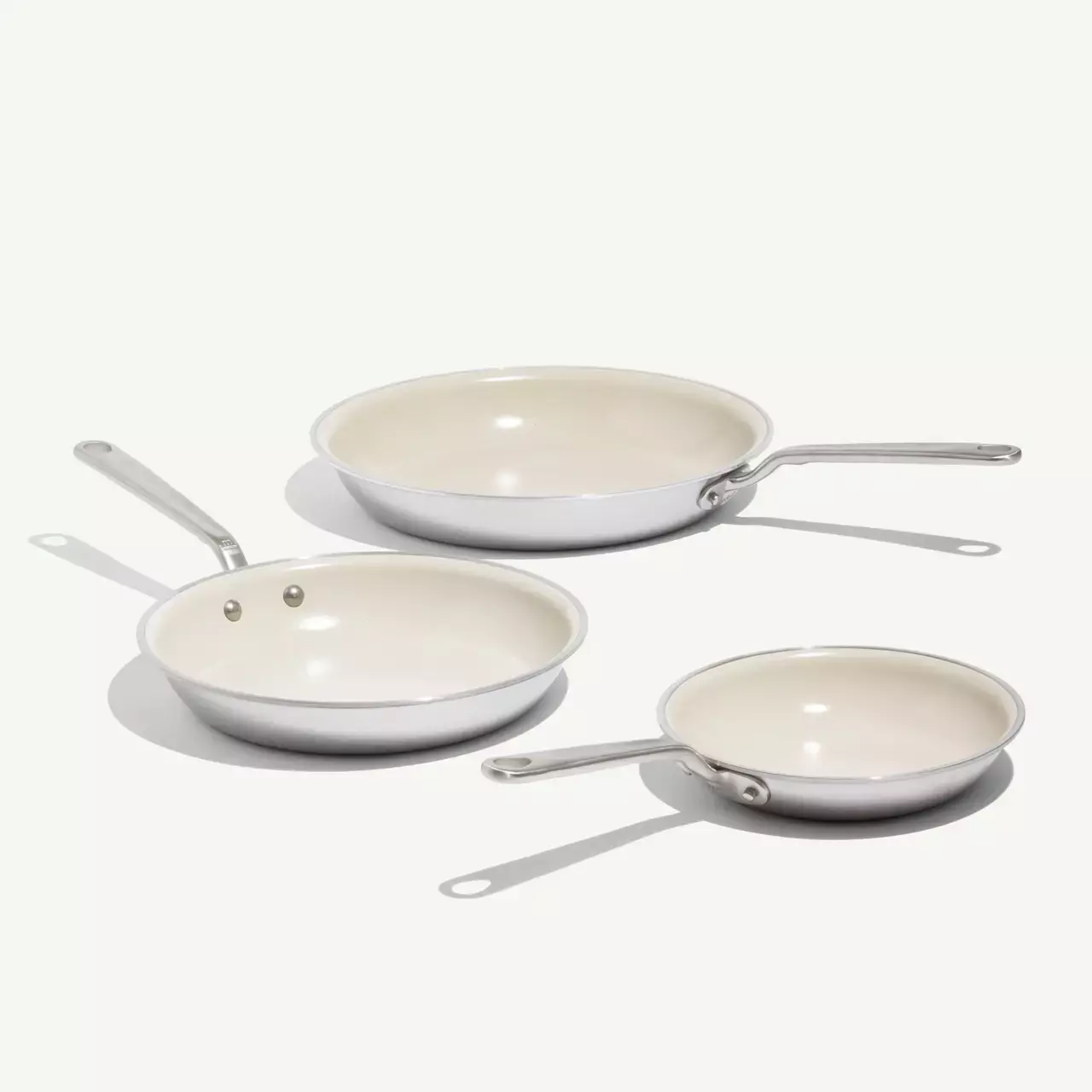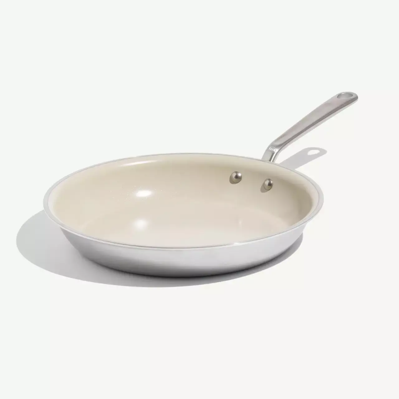 While ceramic pans from other brands use cheaply pasted-on induction discs, ours is optimized for it. Induction discs lead to hot or cold spots—particularly on the sides—while our fully cladded build ensures the entire pan is induction-compatible top to bottom.